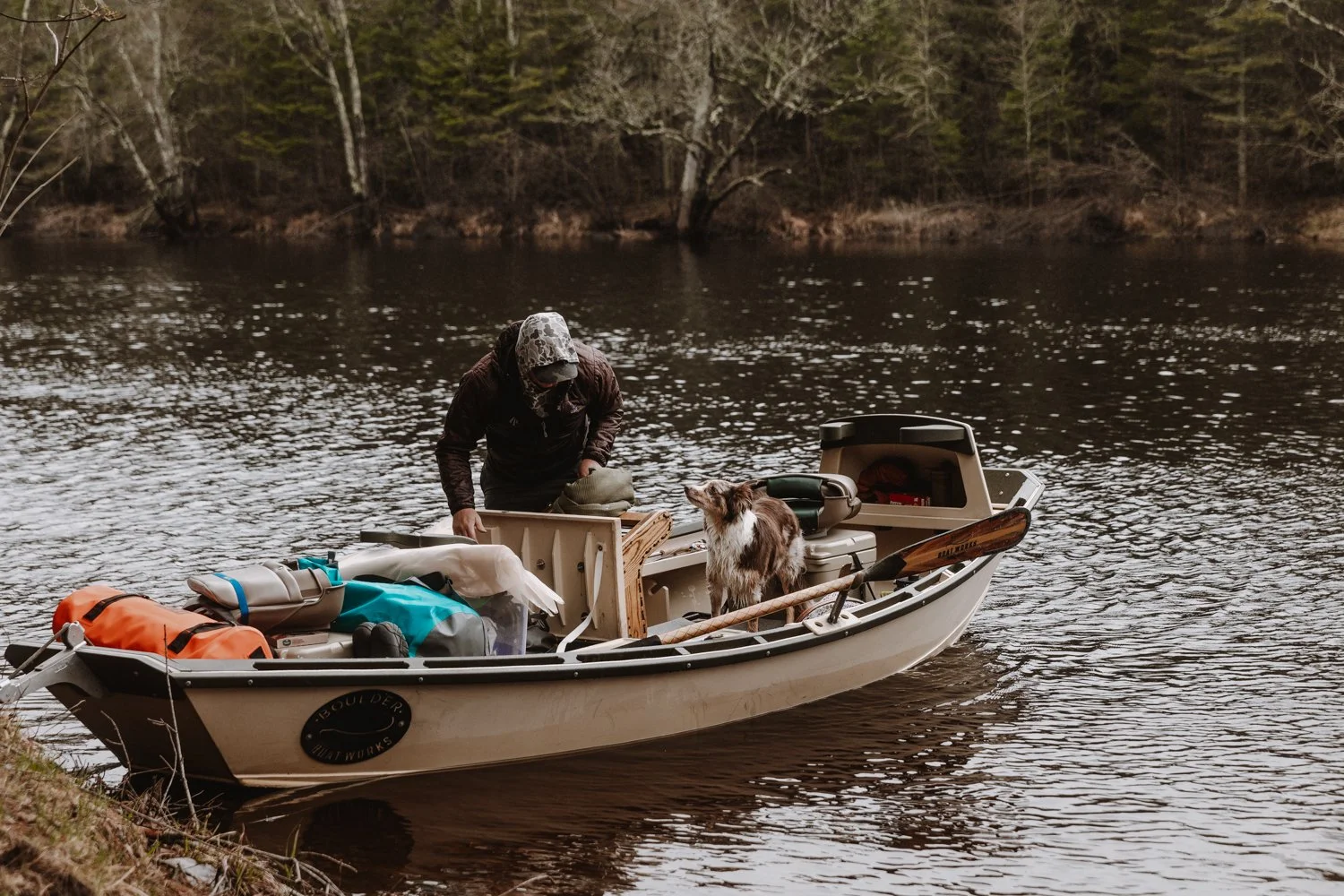 Person on a boat packing gear with a dog aboard on a calm river in a wooded area.